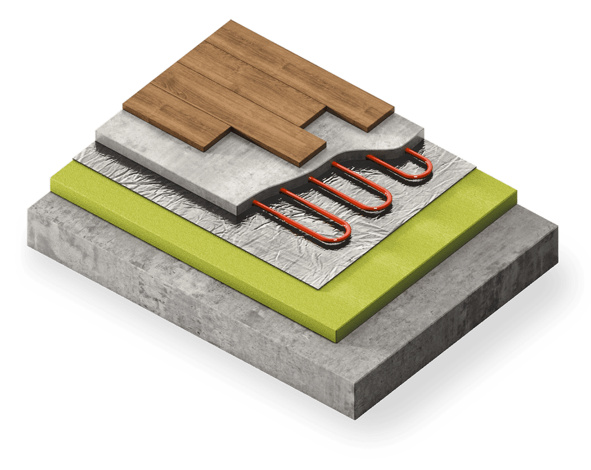 После выполнения подготовительных работ выполняется укладка теплозвукоизоляции пола и всех внутрипольных коммуникаций: труб отопления и канализации, душевых трапов, водяных теплых полов, встроенных в пол радиаторов и конвекторов. После этого заливается цементно-песчаная стяжка.