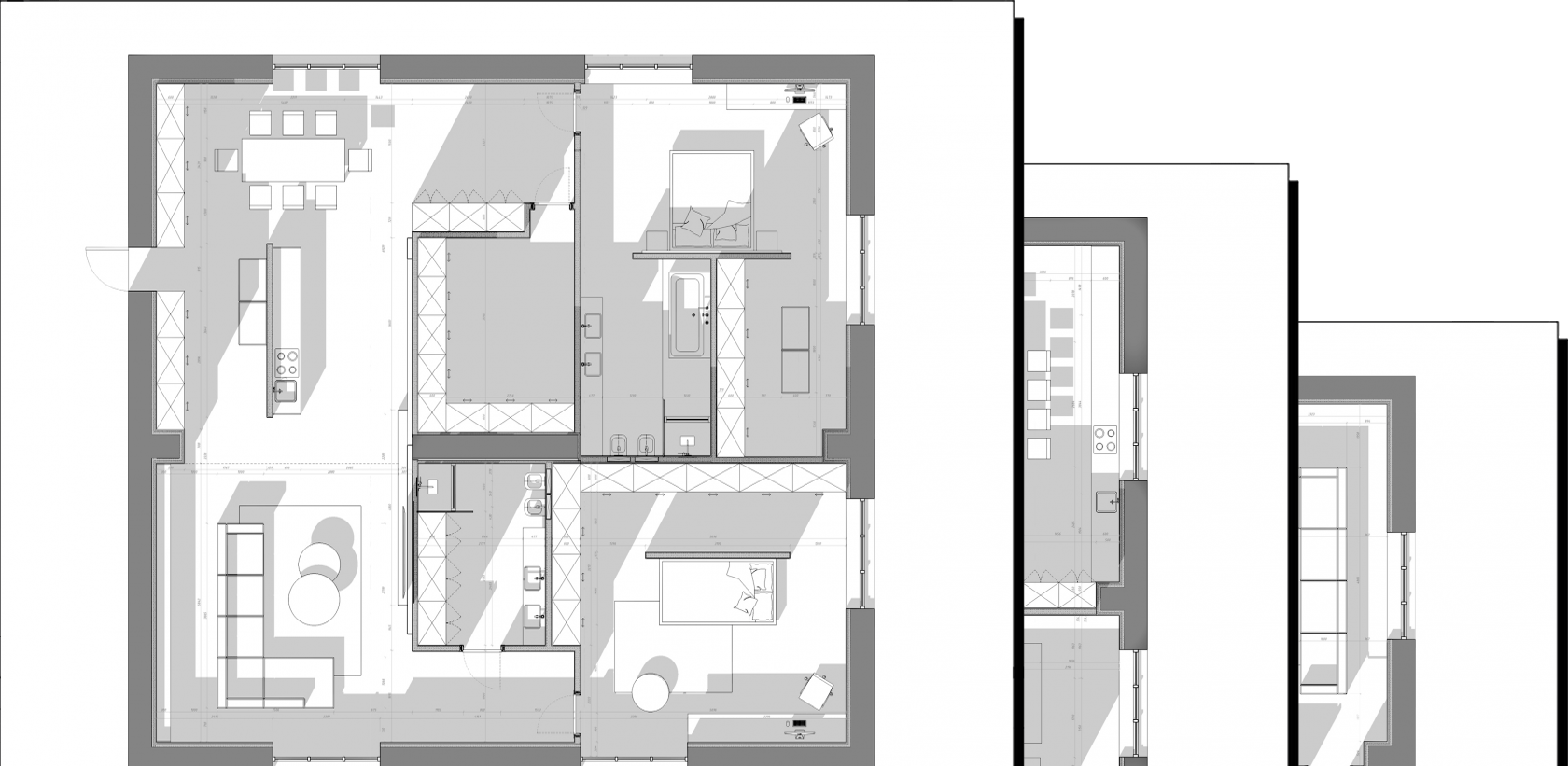 В процессе создания планировочного решения рассматриваются всевозможные комбинации необходимых помещений и зон, а лучшие из них оформляются в варианты планировки.
